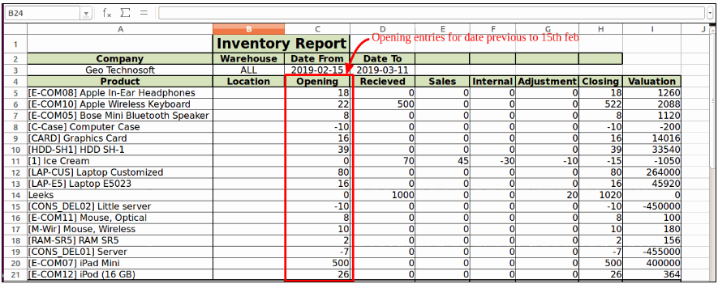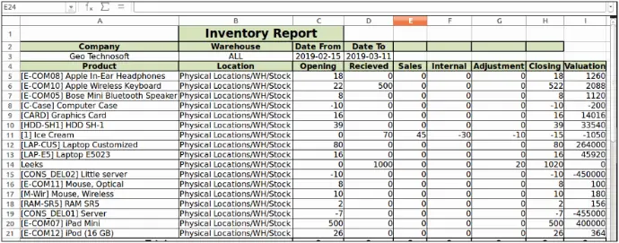 - Besides product name, get details of internal reference, location name, opening stock, incoming quantities, outgoing quantities, adjusted quantities, internal transfers and closing stock.